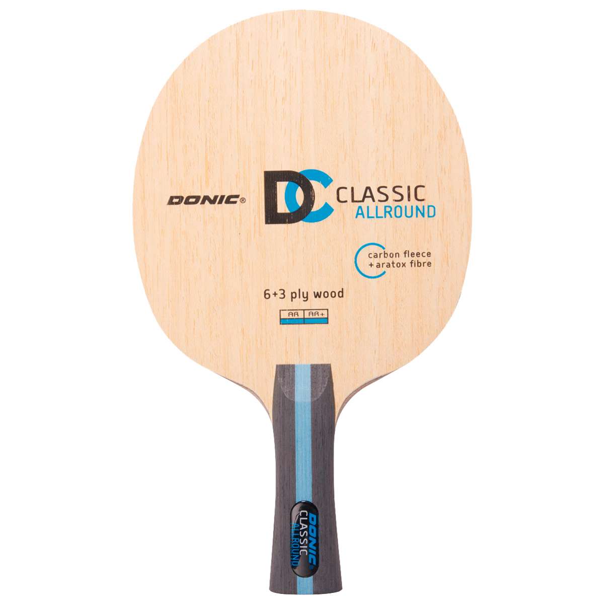 Déjà, le noyau du DONIC CLASSIC ALLROUND nous montre à quel point les matériaux modernes se distinguent de ceux des générations précédentes. La fibre ARATOX intégrée est plutôt une couche collante qu’un placage au sens traditionnel du terme et elle n’est pas comparable aux couches de carbone classiques utilisé par la passé. L’intégration de bois comme le Limba et le Koto, mais surtout la combinaison harmonieuse de tous les matériaux, donnent un résultat qui transmet à la fois le meilleur contrôle possible, la vitesse requise et le toucher attendu.